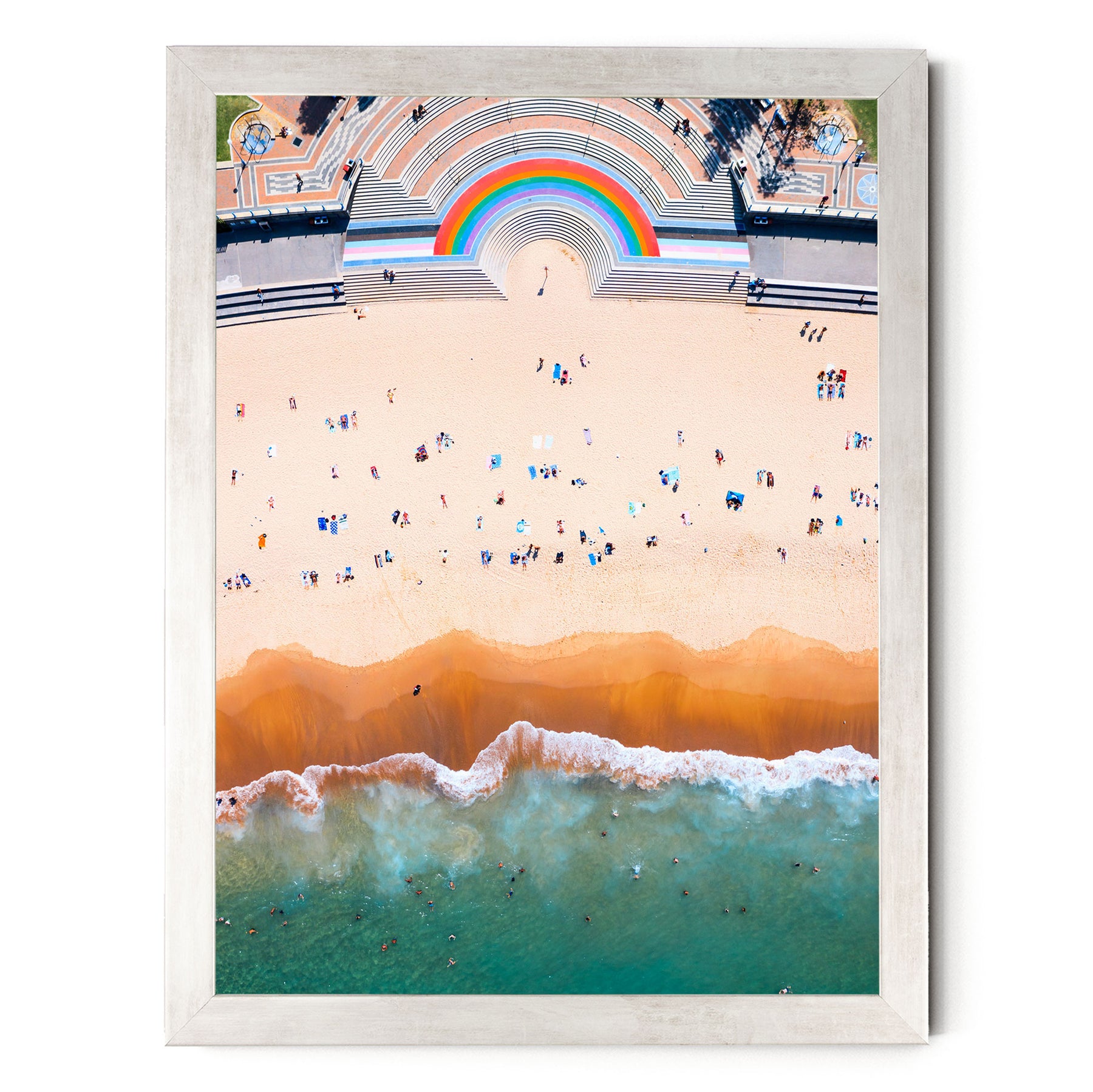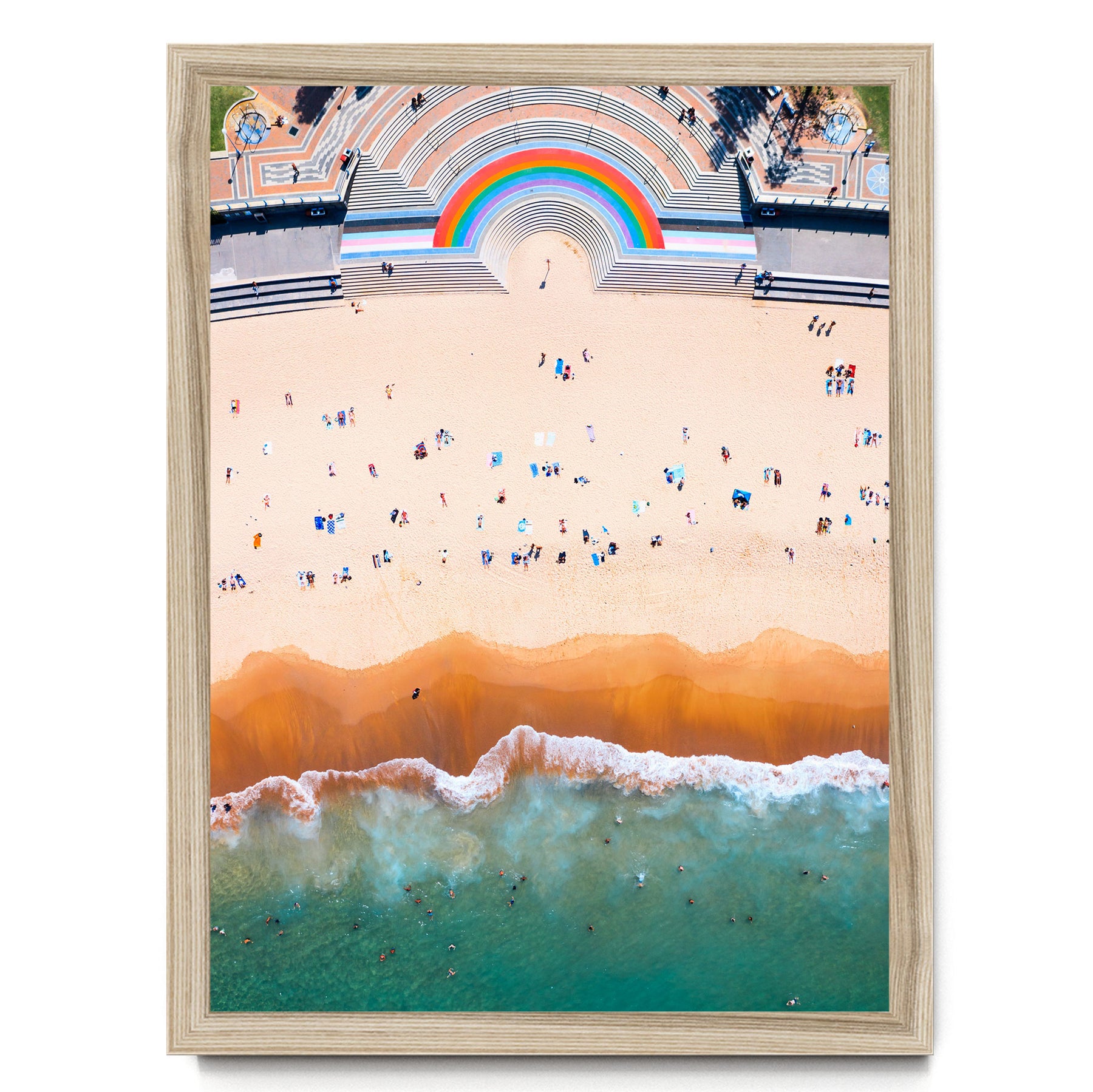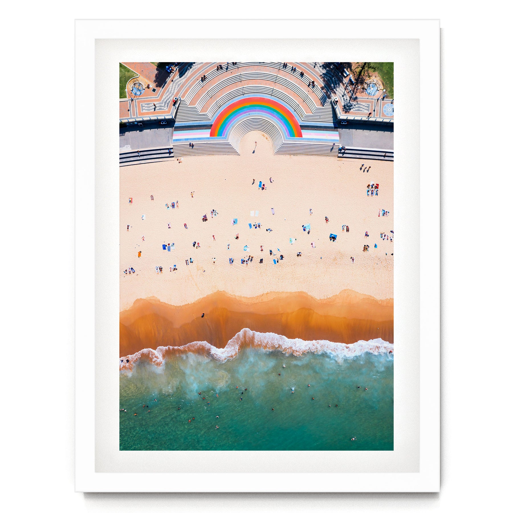 The image is an aerial view of a beach with a crowd of people enjoying the sunny day. The beach has a vibrant, colorful atmosphere with a rainbow arching over the top. The ocean is a beautiful shade of turquoise, and the sky is a clear blue. The image is framed and appears to be a collage of multiple images, creating a visually striking and dynamic scene.