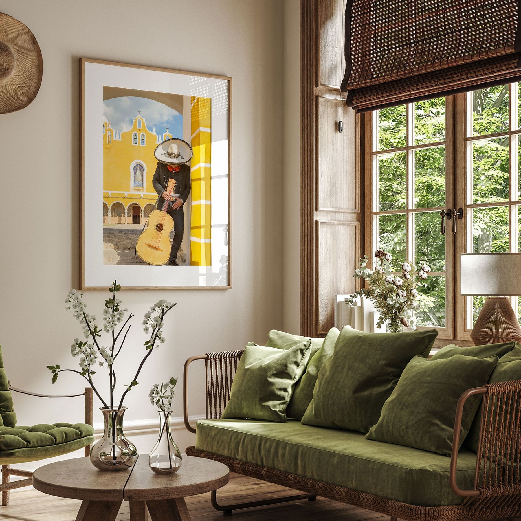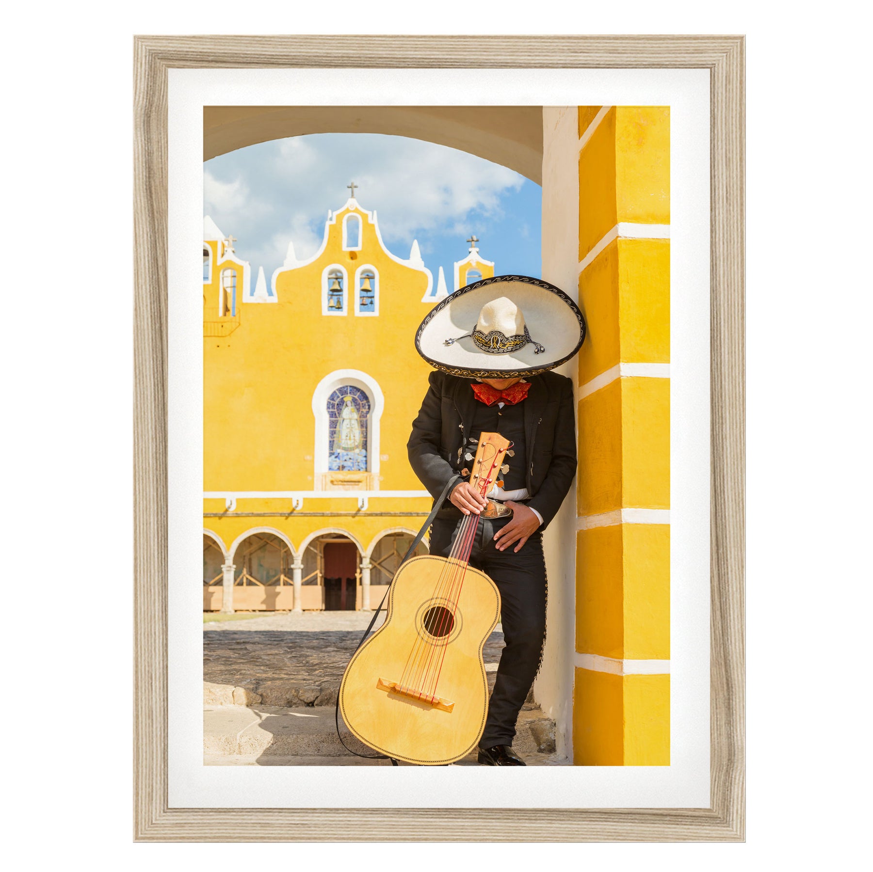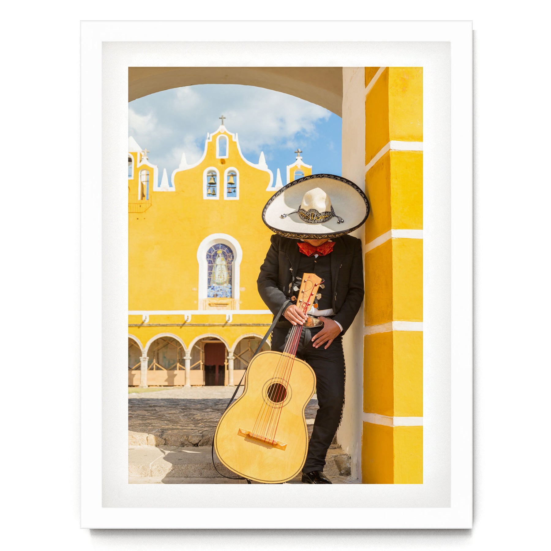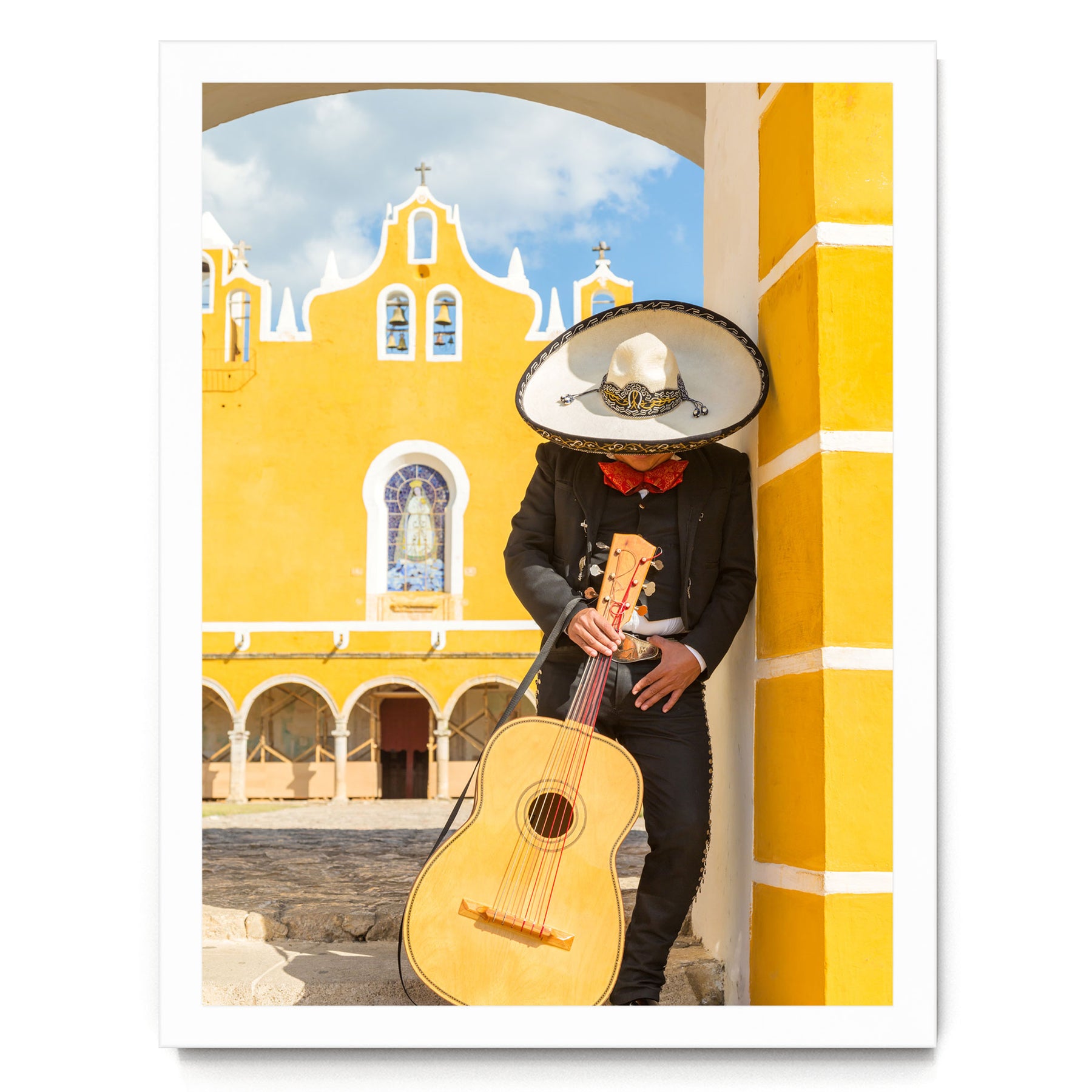 A person dressed in a traditional Mexican outfit, including a sombrero, is holding a guitar and leaning against a yellow building with arched windows.