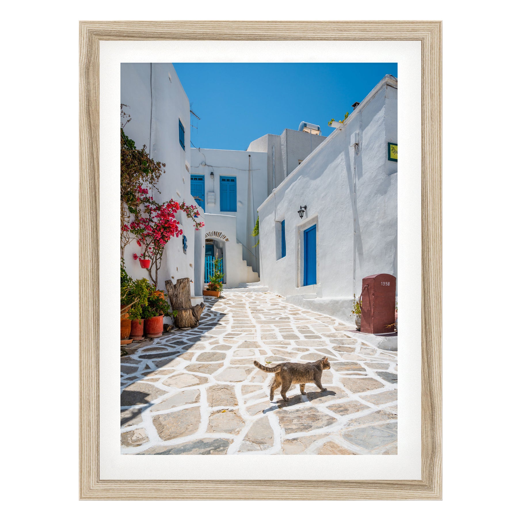 A cat walks down a cobblestone street lined with white buildings and colorful flowers, framed in a black frame.