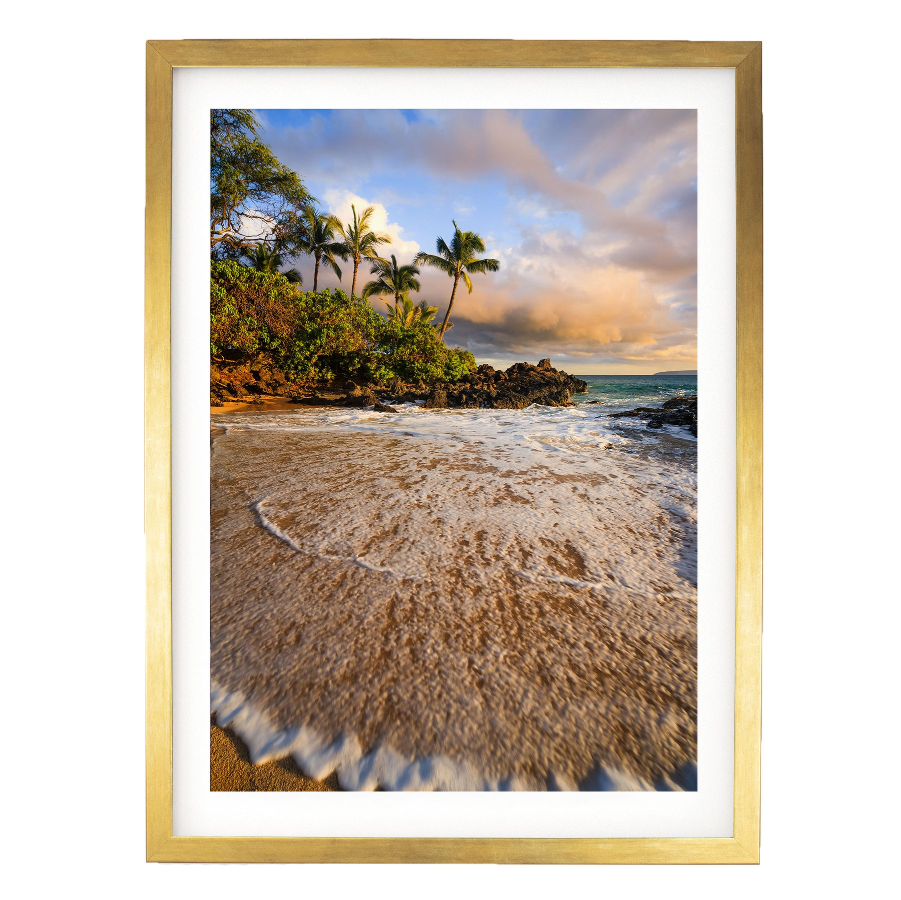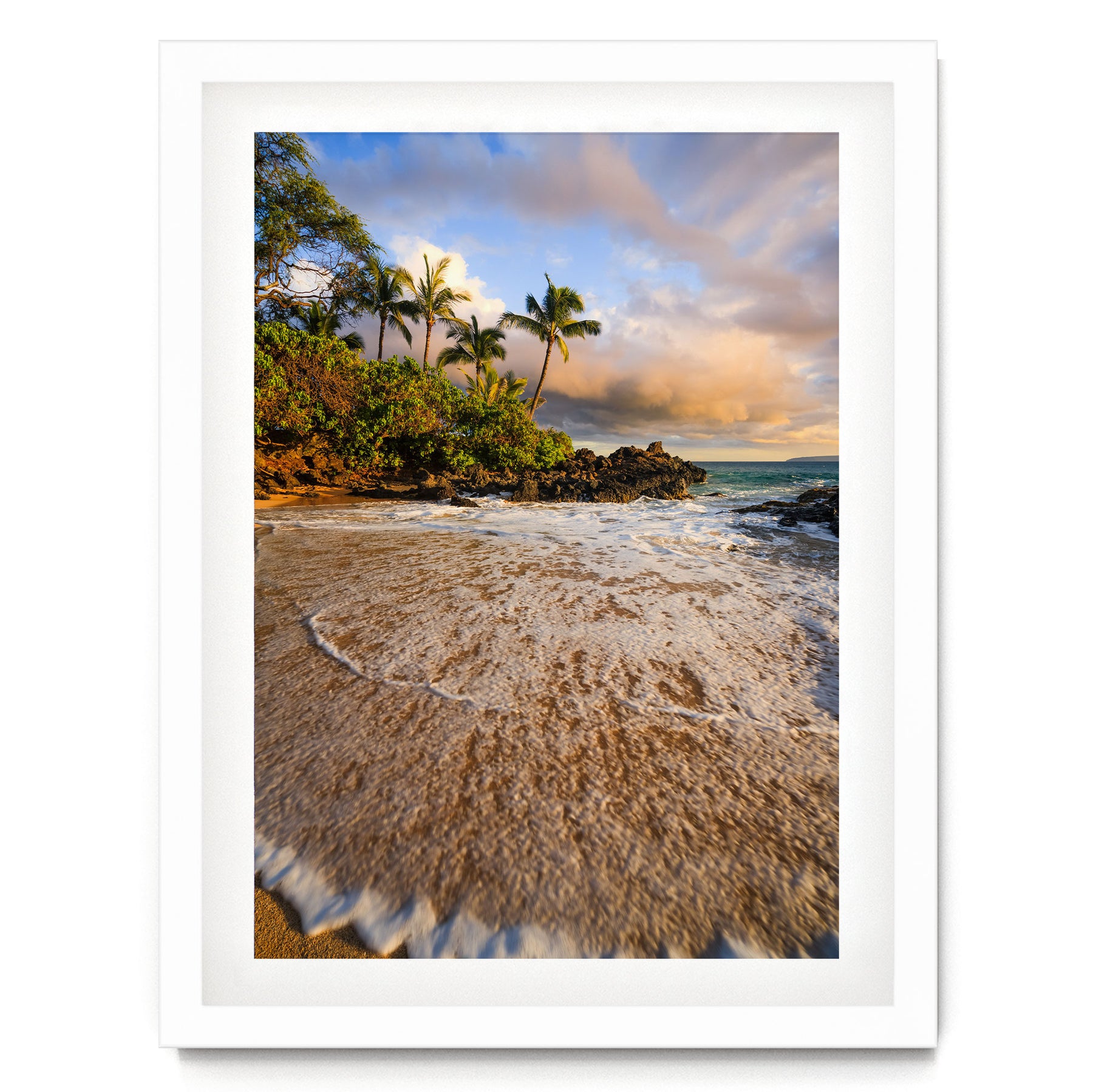 A framed photograph depicting a serene beach scene with palm trees, crashing waves, and a colorful sky at sunset.