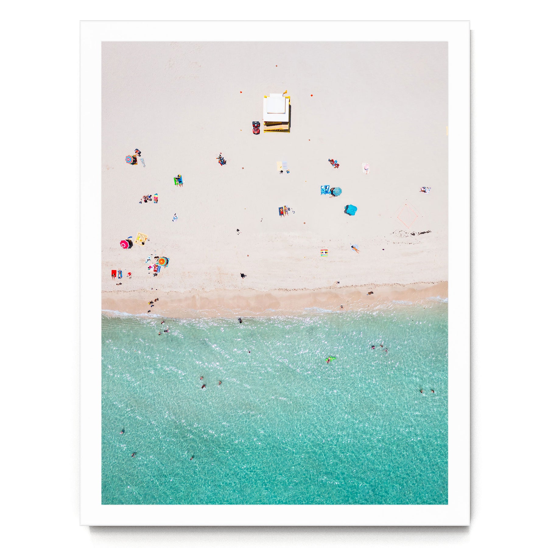 The image is a framed aerial view of a beach scene with people enjoying the sun and water.
