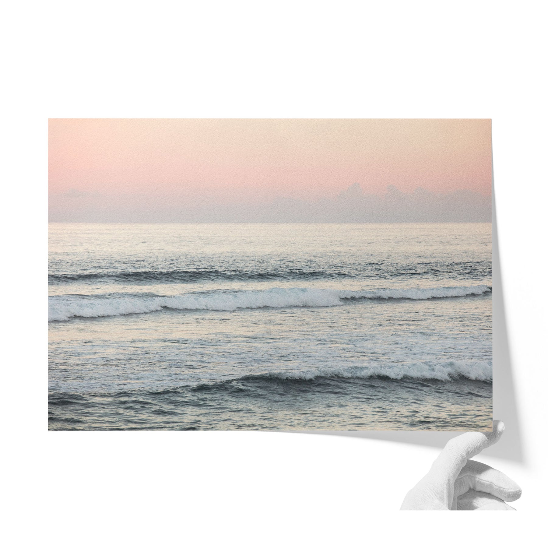 A serene ocean scene with waves gently lapping against the shore, set against a soft pink and orange sky.