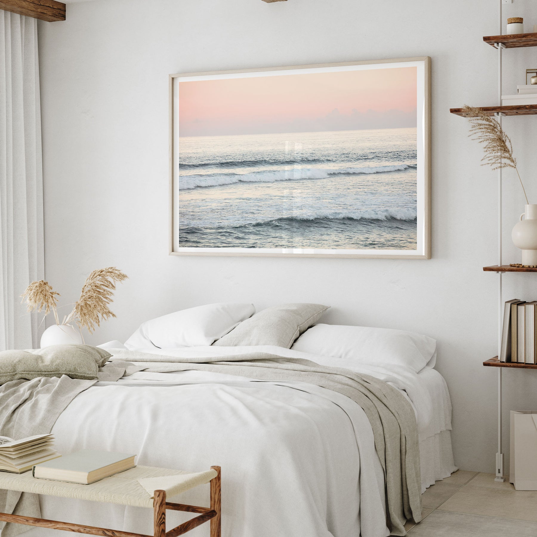 a serene bedroom scene with a large framed picture of a beach at sunset hanging on the wall above a bed with white linens and a gray throw blanket.