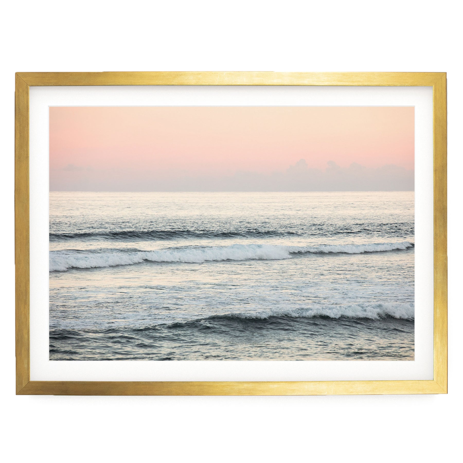 A serene ocean scene with waves gently lapping against the shore, framed in a gold frame.