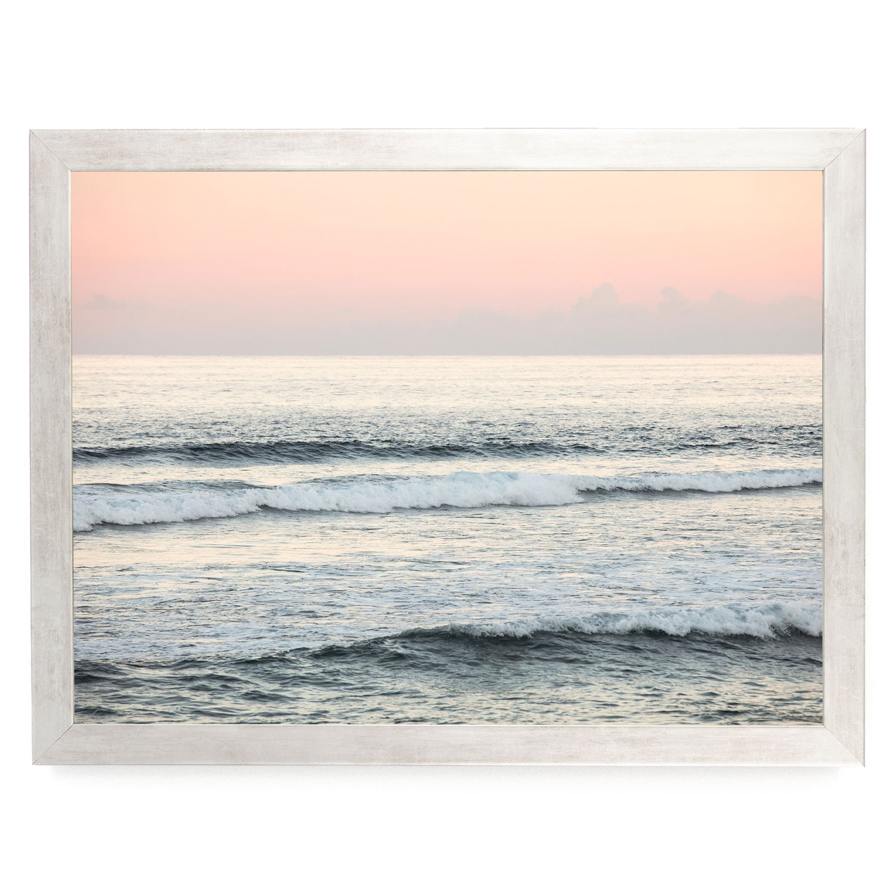 A serene ocean scene with waves gently lapping against the shore, framed in a white wooden frame.