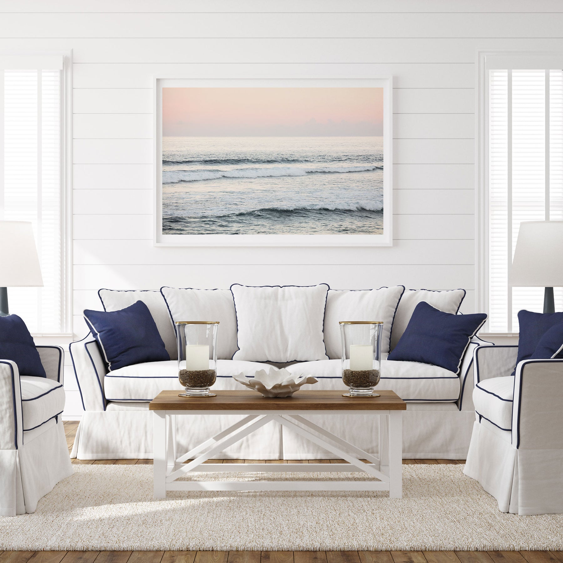 a serene living room with a white sofa, a wooden coffee table, and a framed picture of the ocean on the wall.