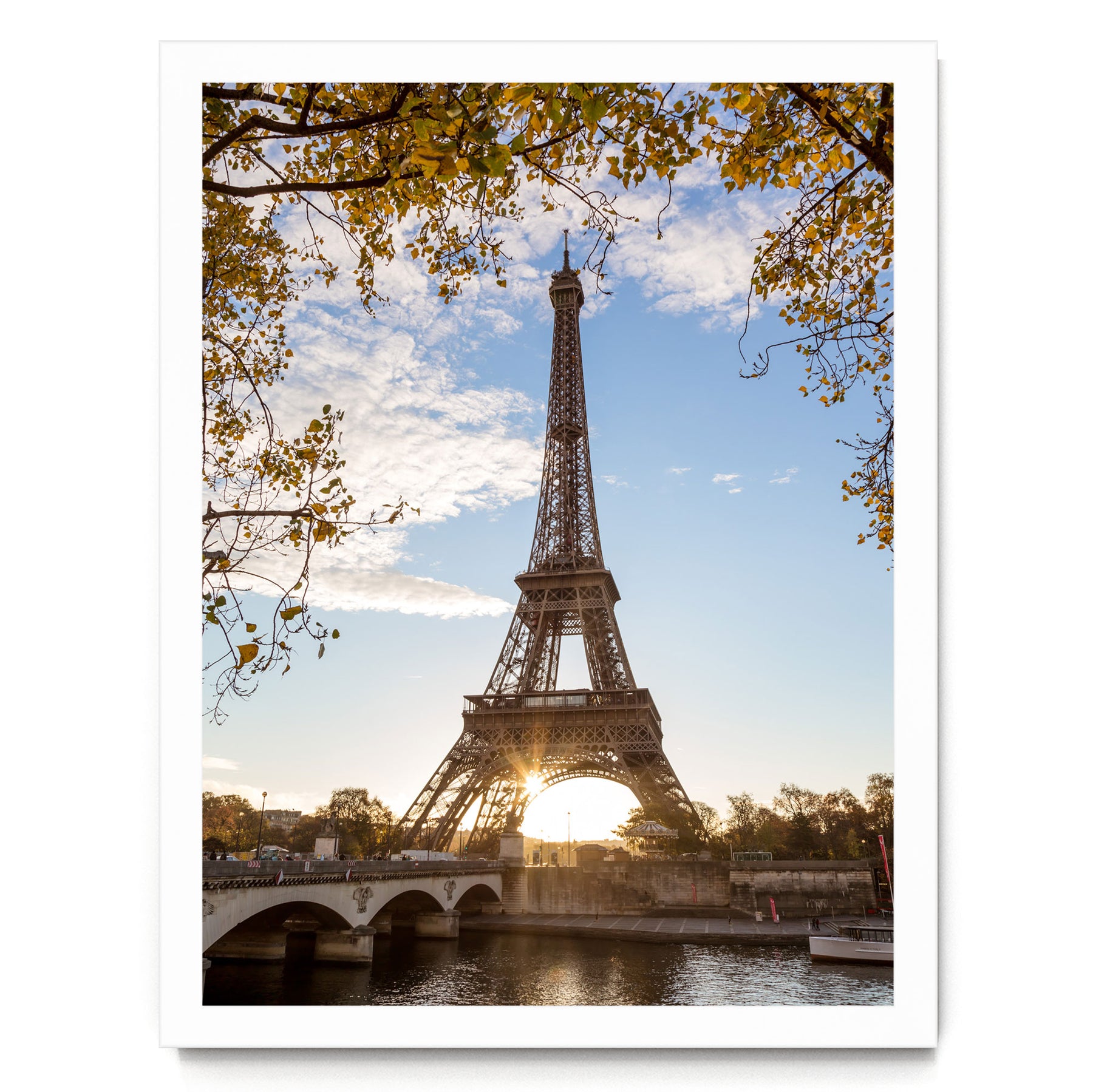 the Eiffel Tower in Paris, France, with a bridge and trees in the foreground, and the sun setting in the background.