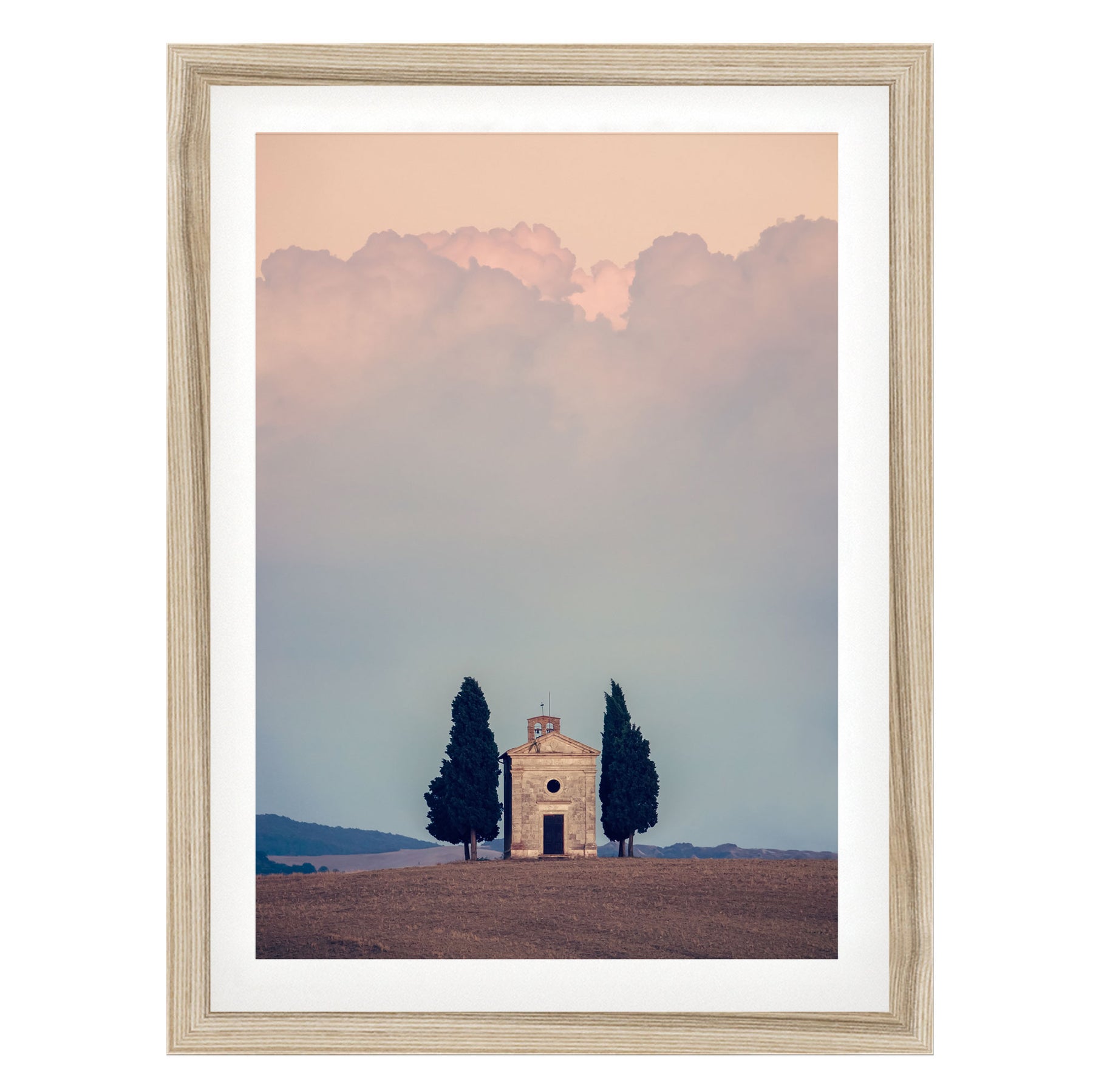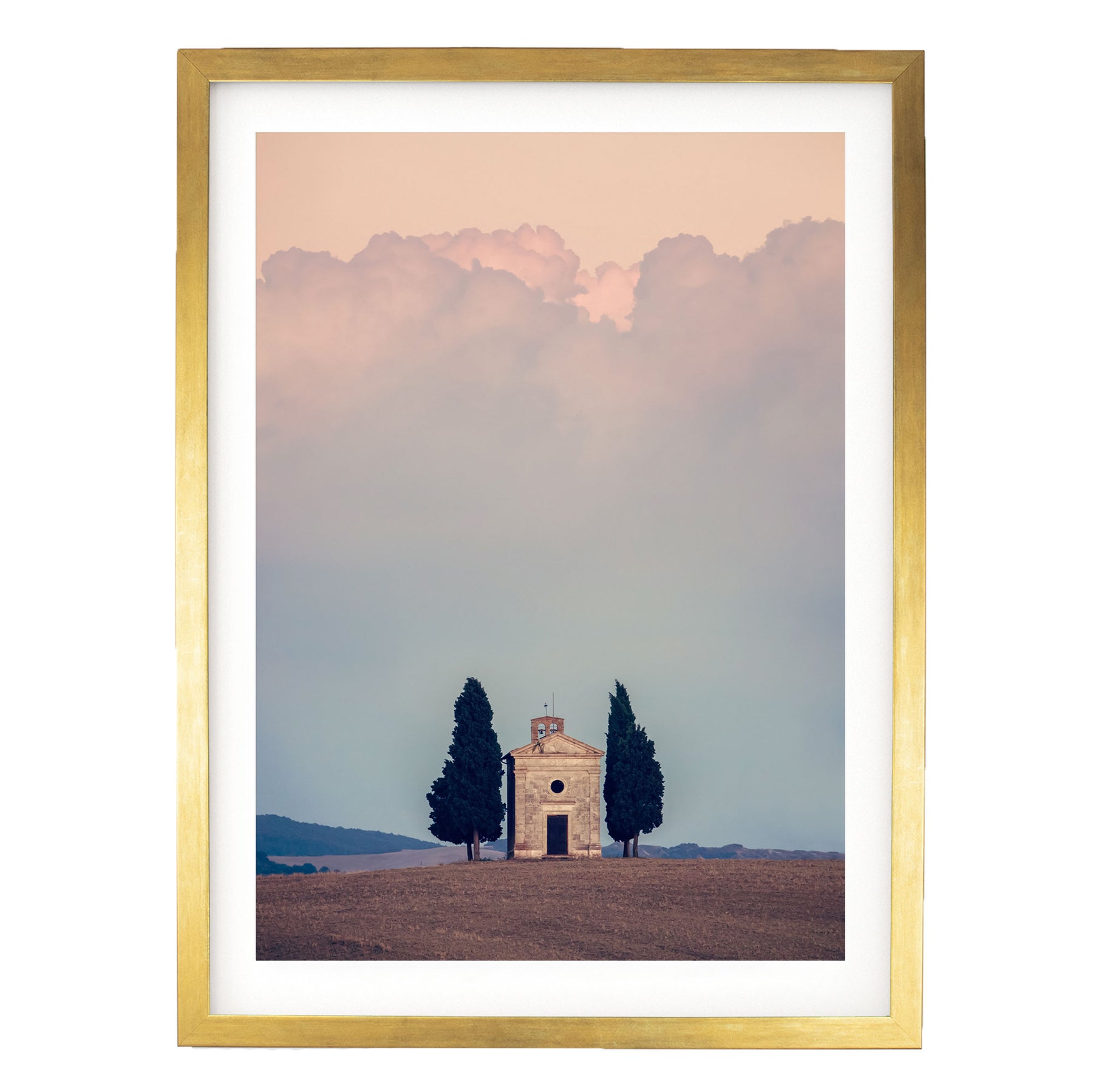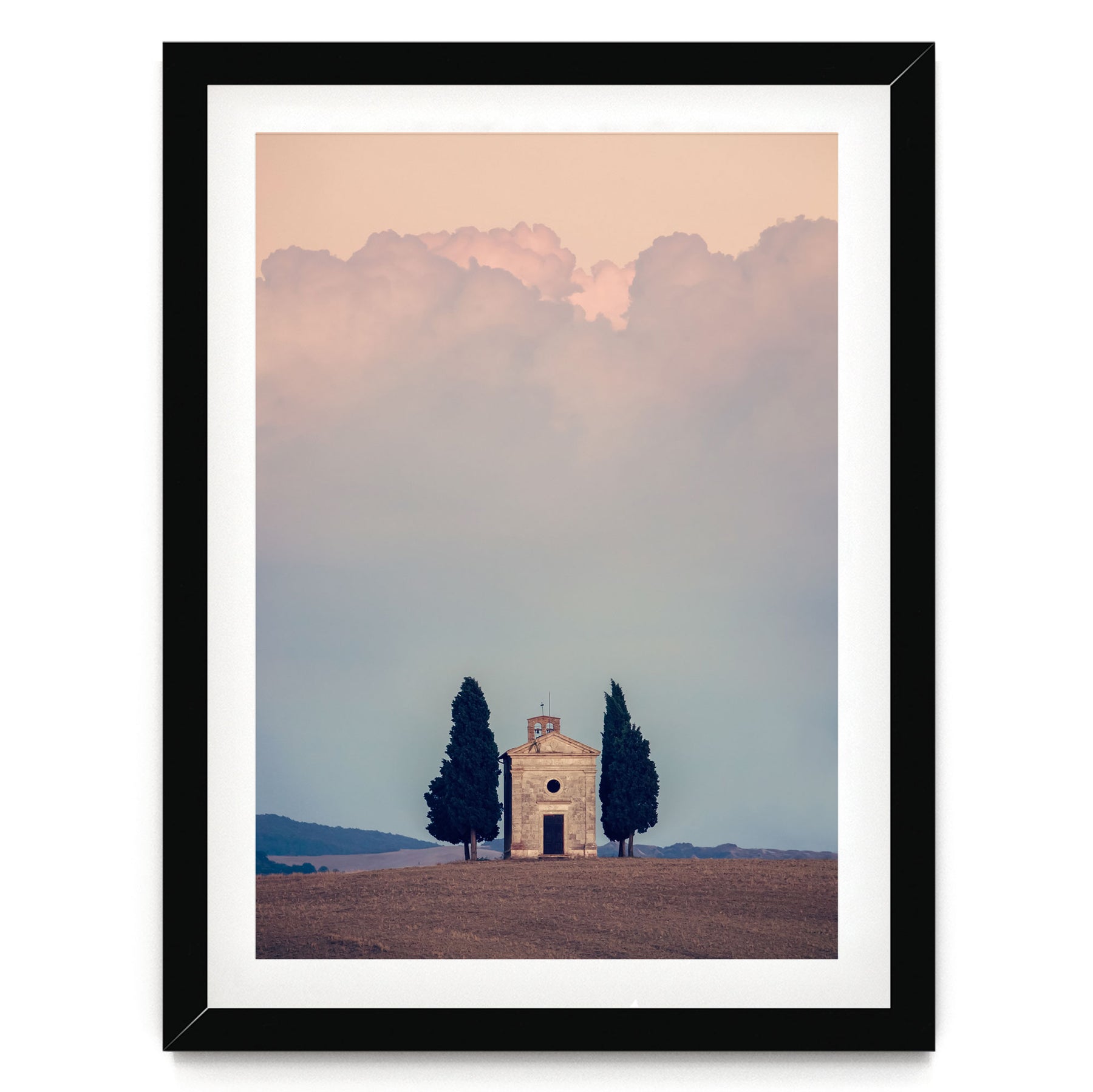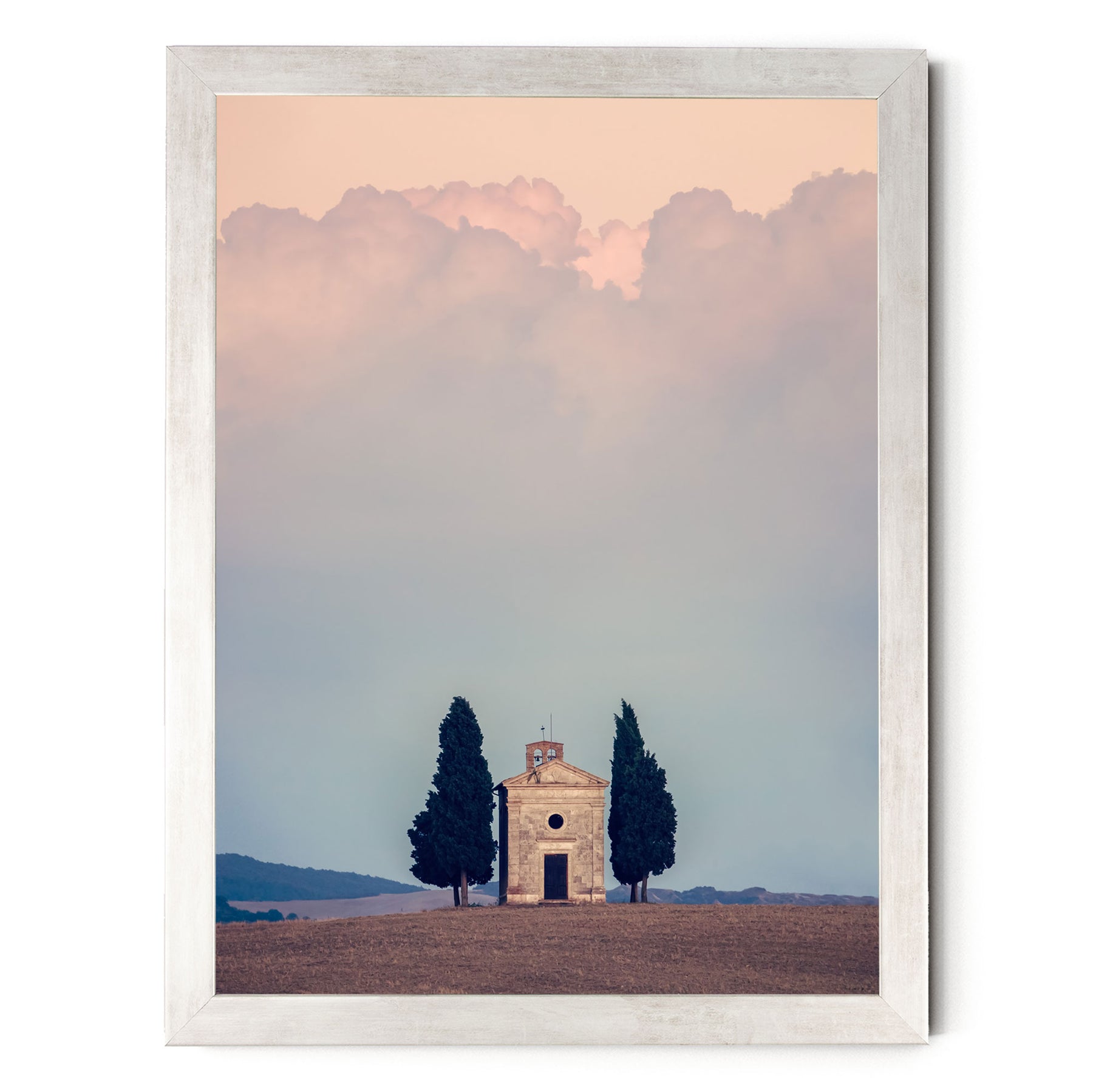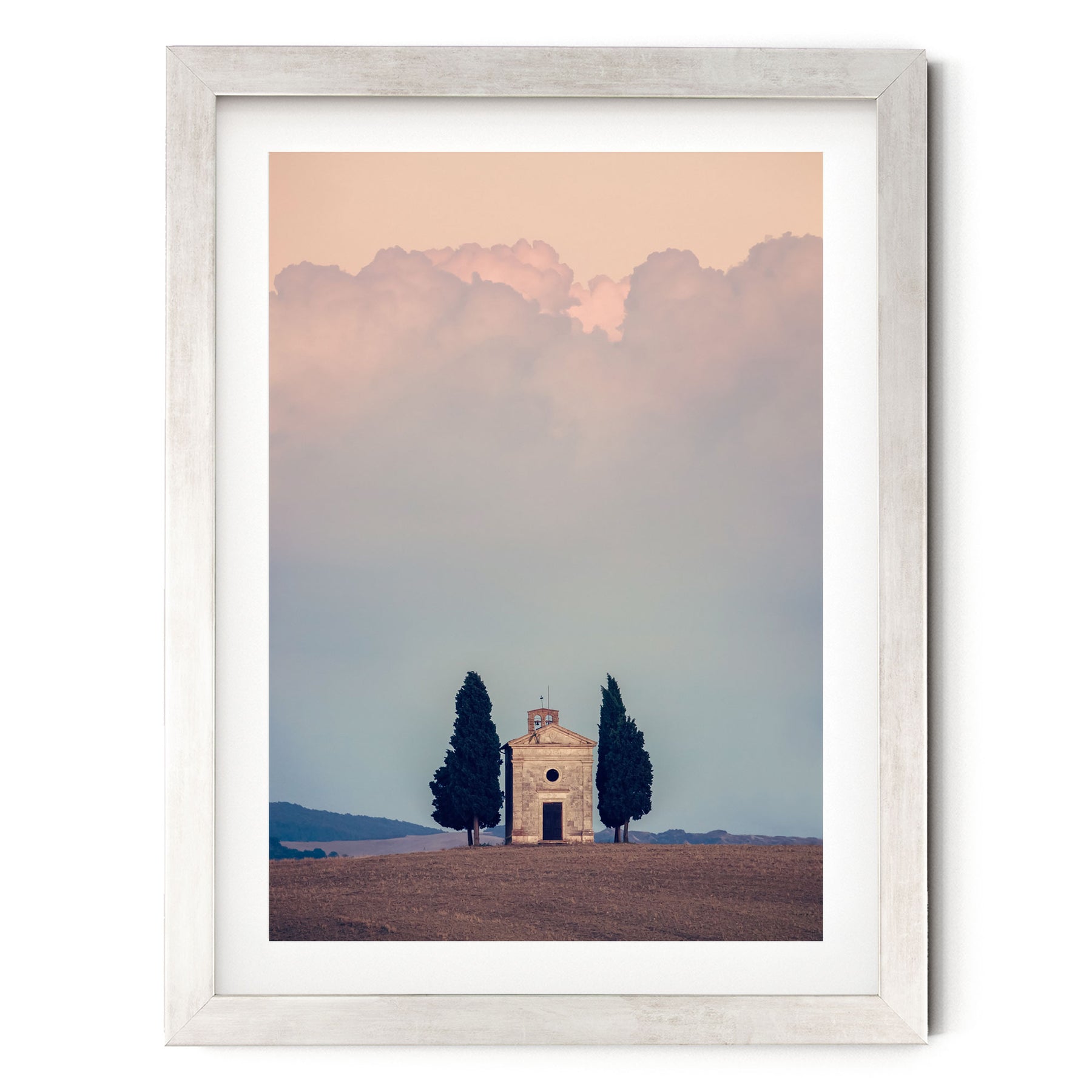 A white framed picture depicting a small stone church with two tall cypress trees in the foreground, set against a cloudy sky.