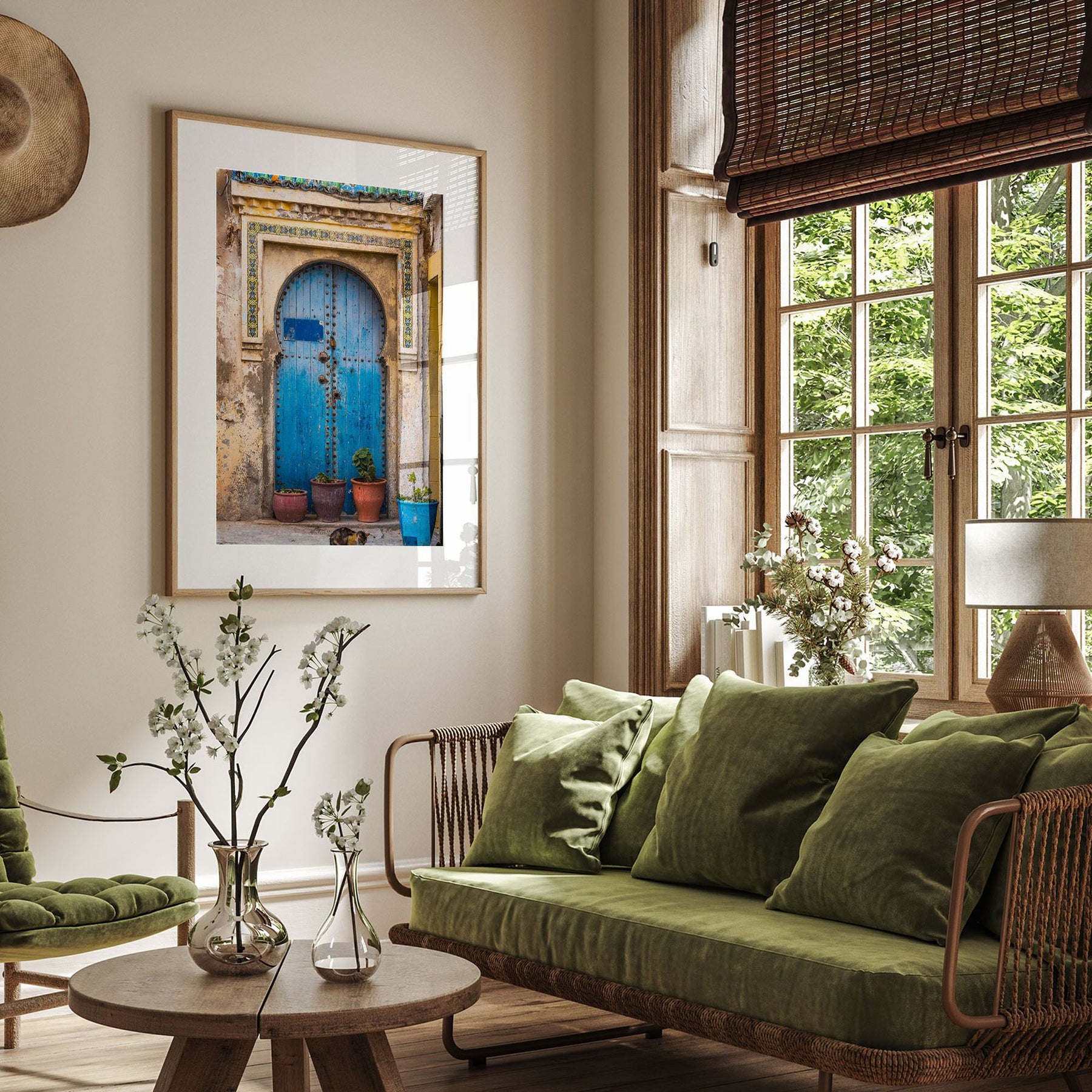 a cozy living room with a large window overlooking a lush green outdoor scene. The room is furnished with a green sofa, a coffee table, and a framed picture of a blue door with a green shutters. The room is decorated with potted plants and vases, creating a warm and inviting atmosphere.