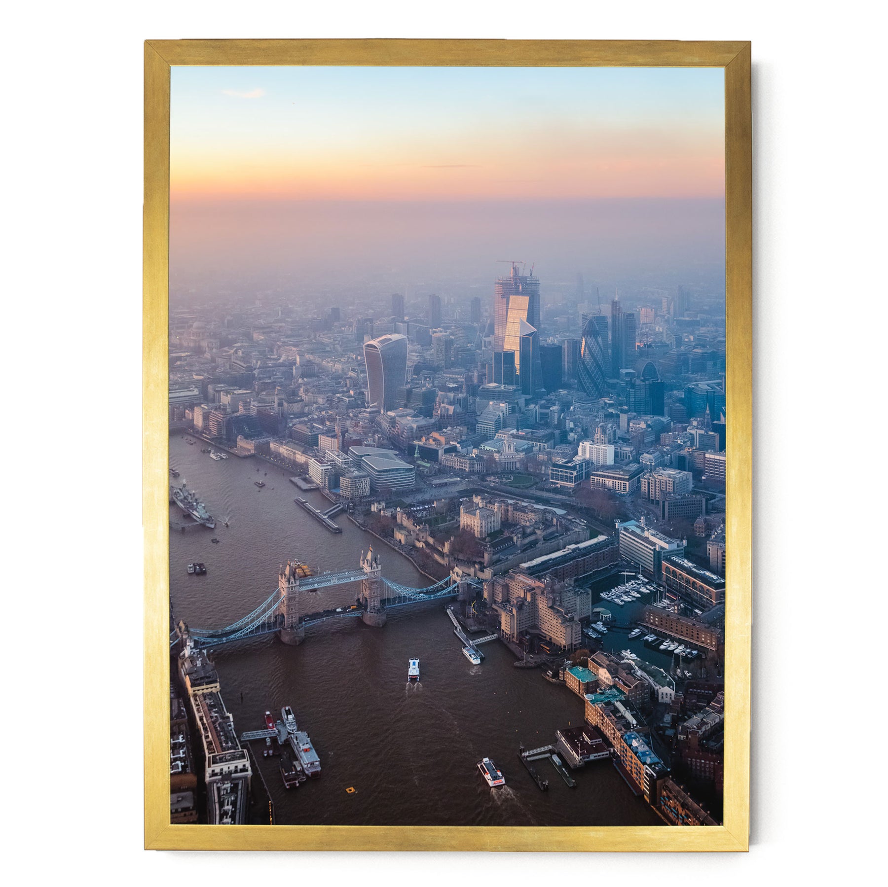 An aerial view of the London skyline, showcasing the iconic Tower Bridge and the surrounding cityscape.