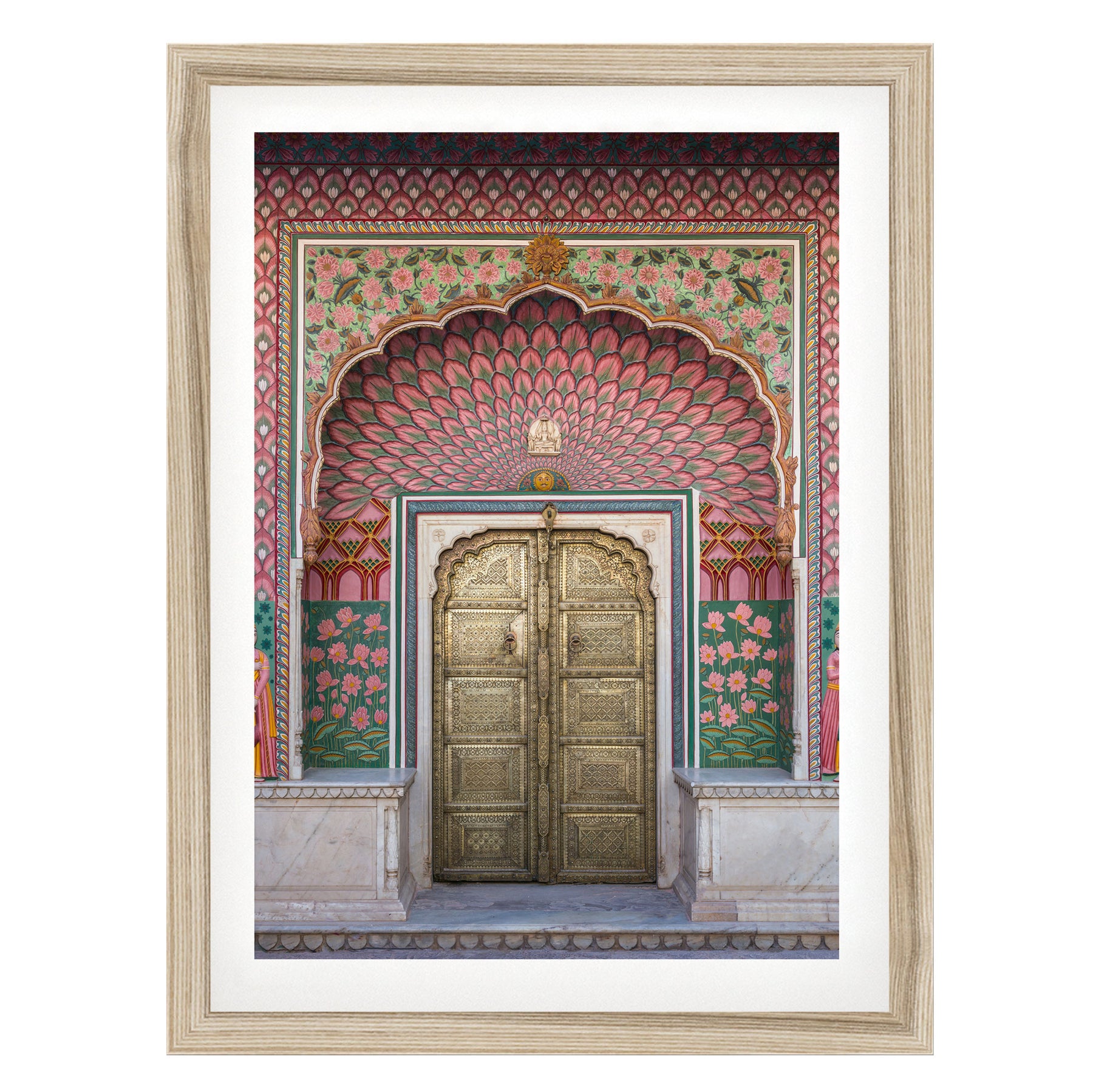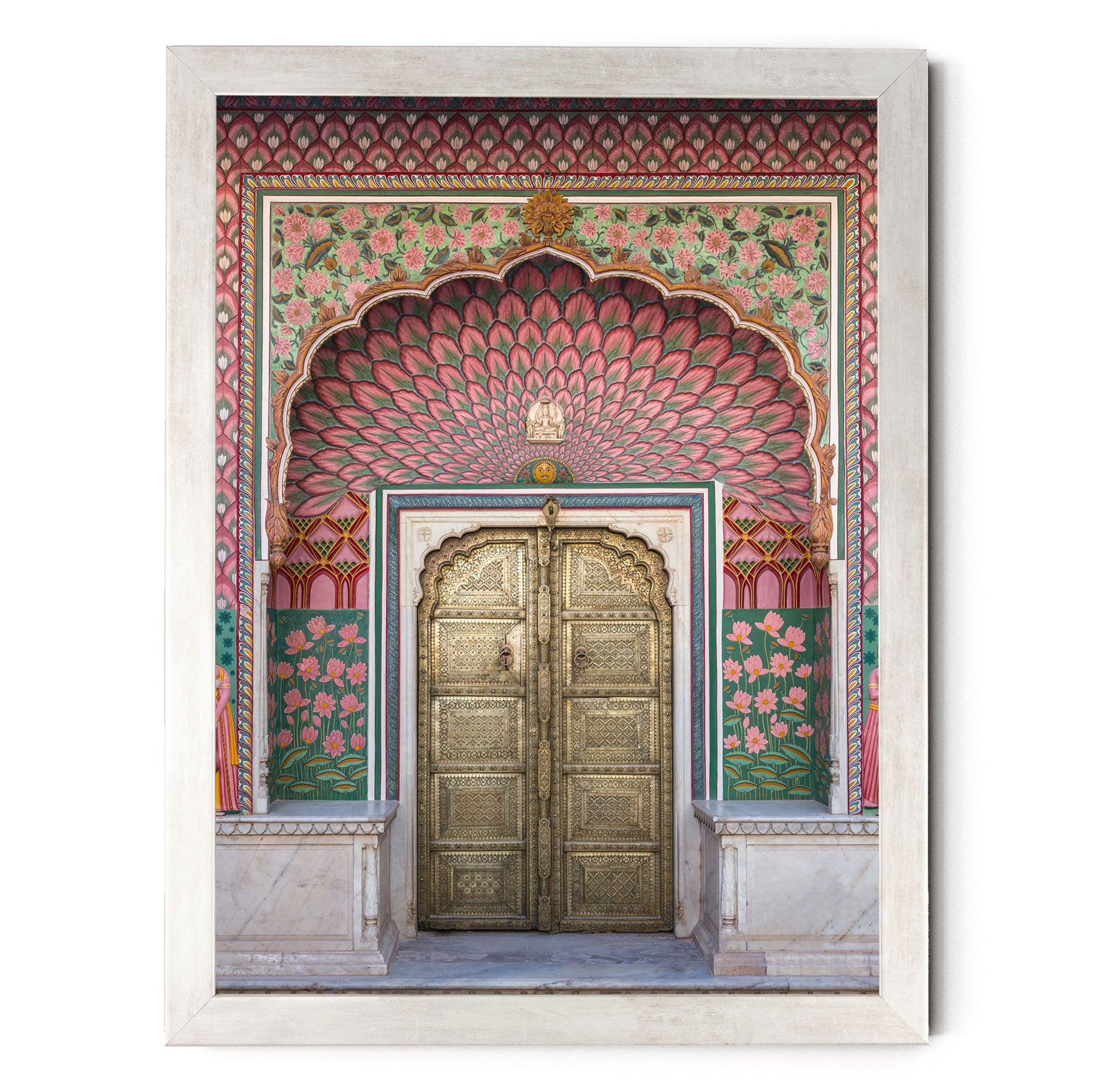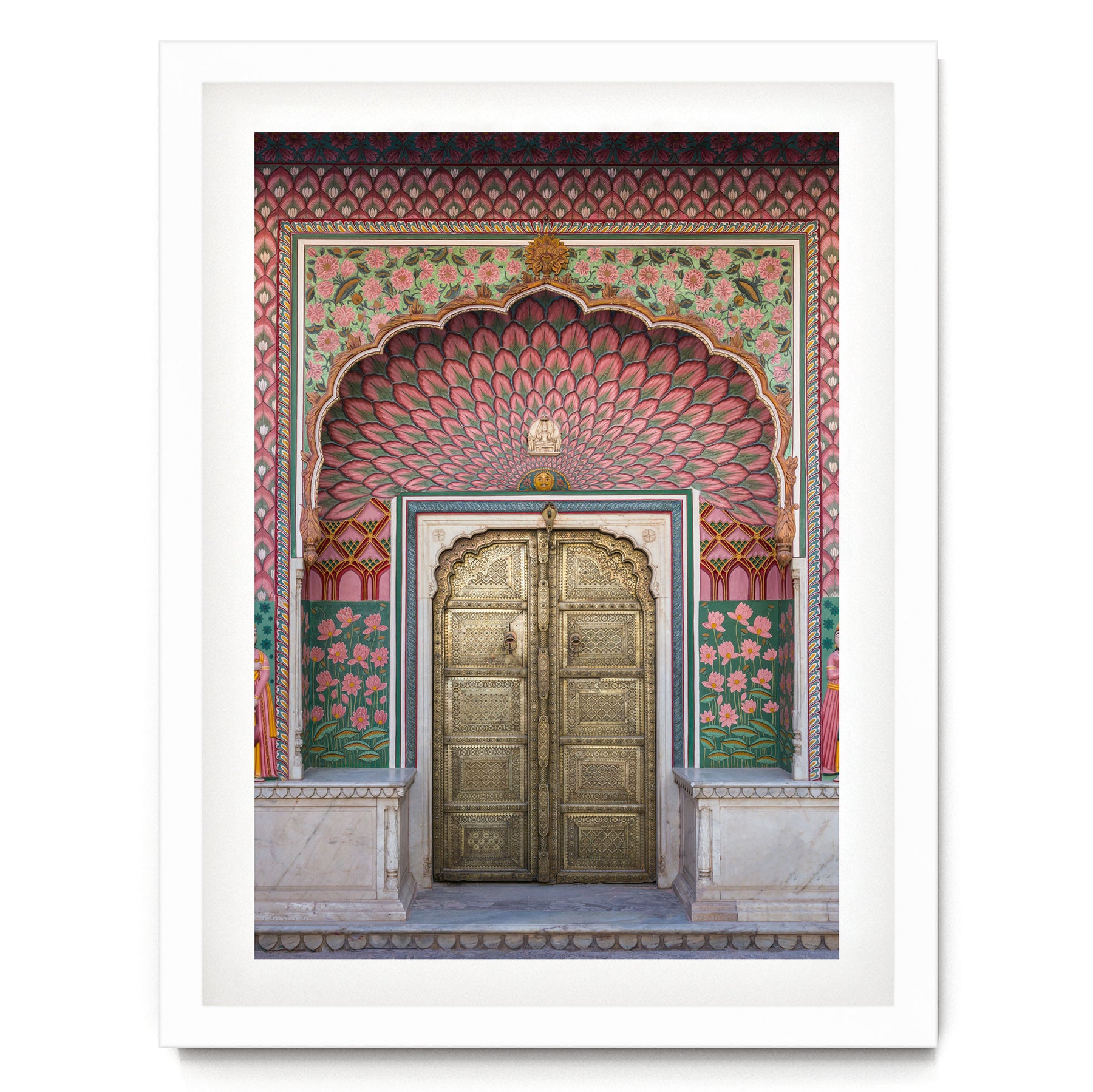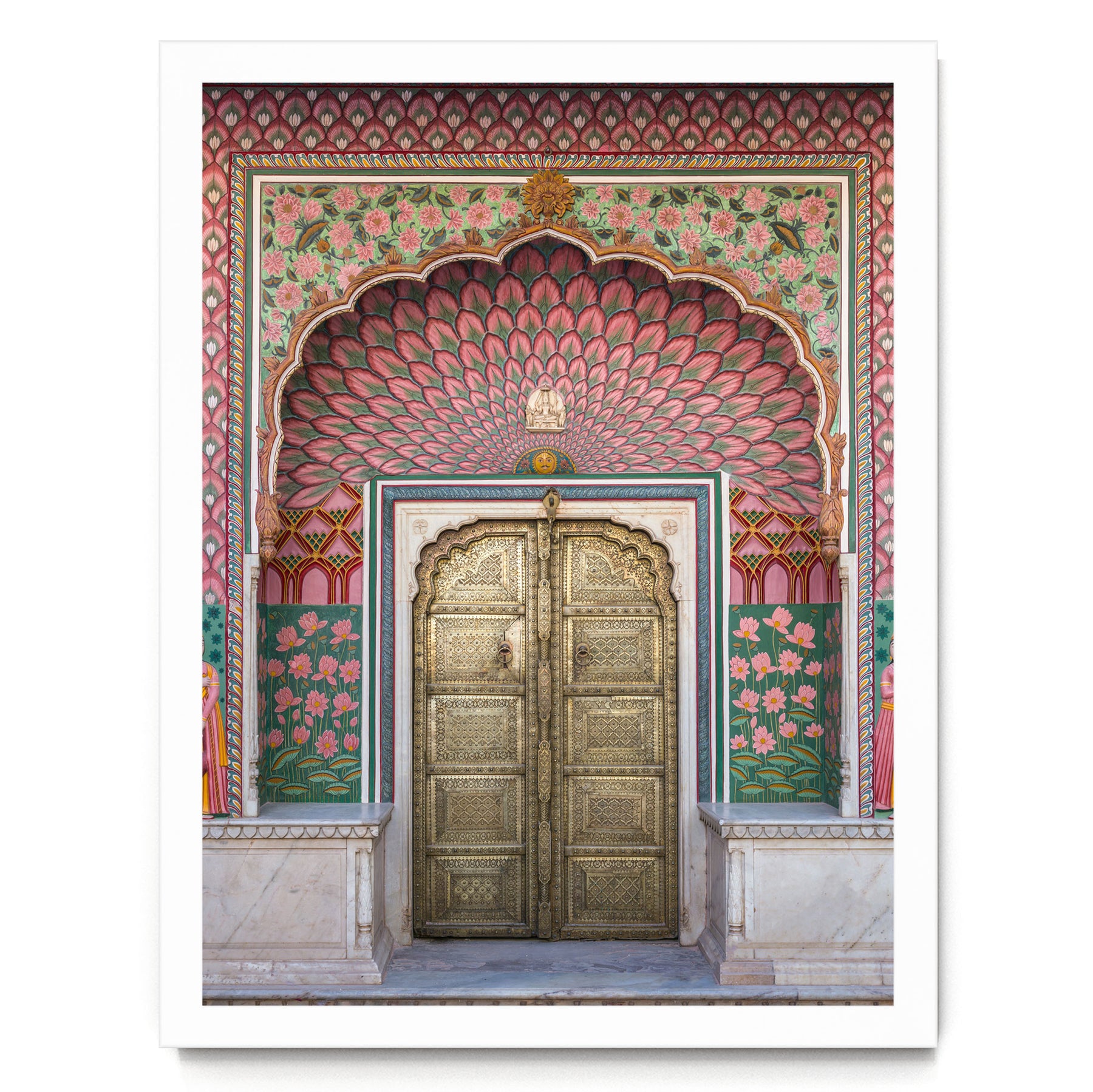 a beautifully decorated doorway with intricate patterns and vibrant colors, including pink, green, and gold elements.