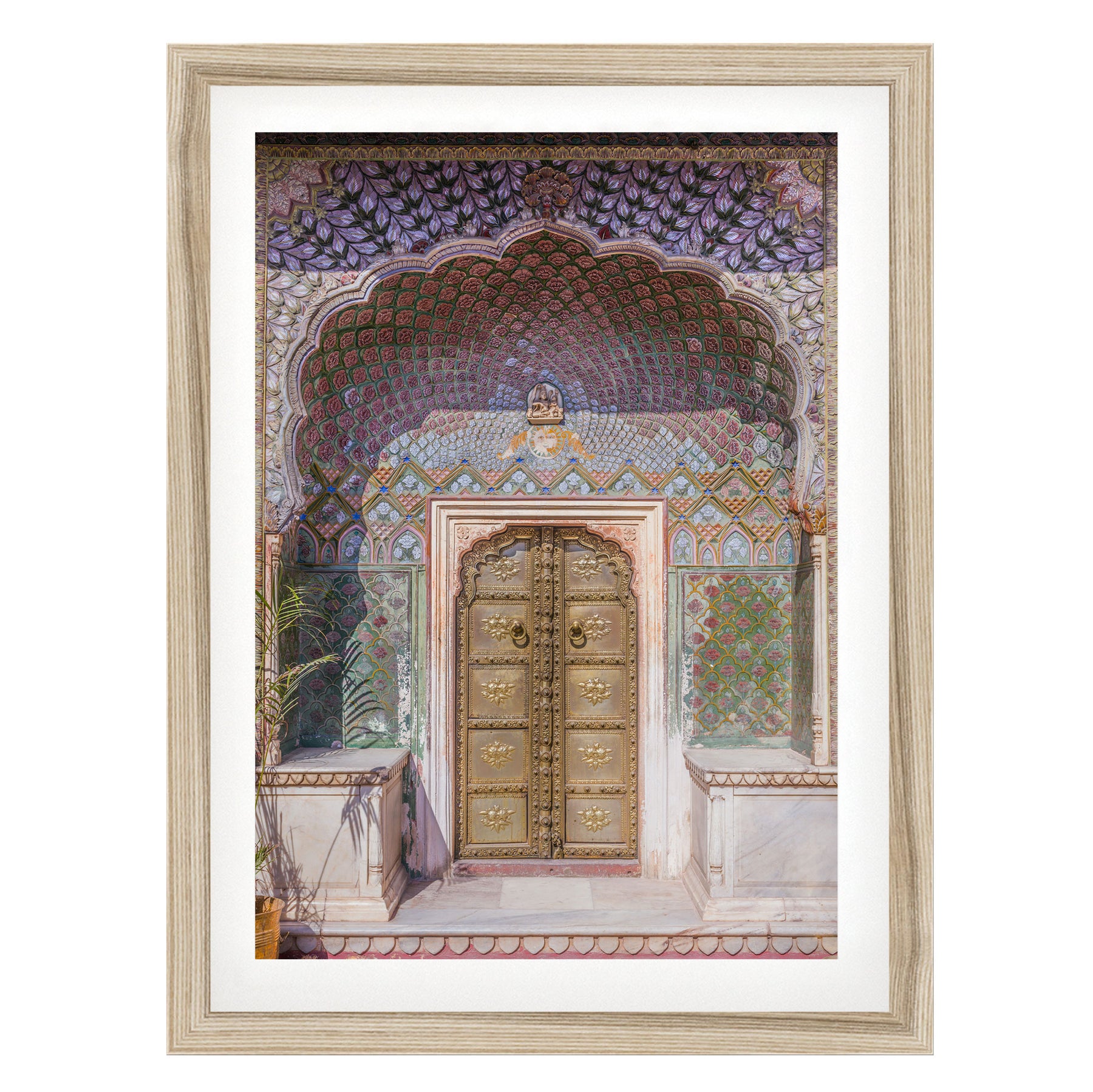 a large, ornate golden door with intricate designs and patterns, set within a colorful, decorative archway.