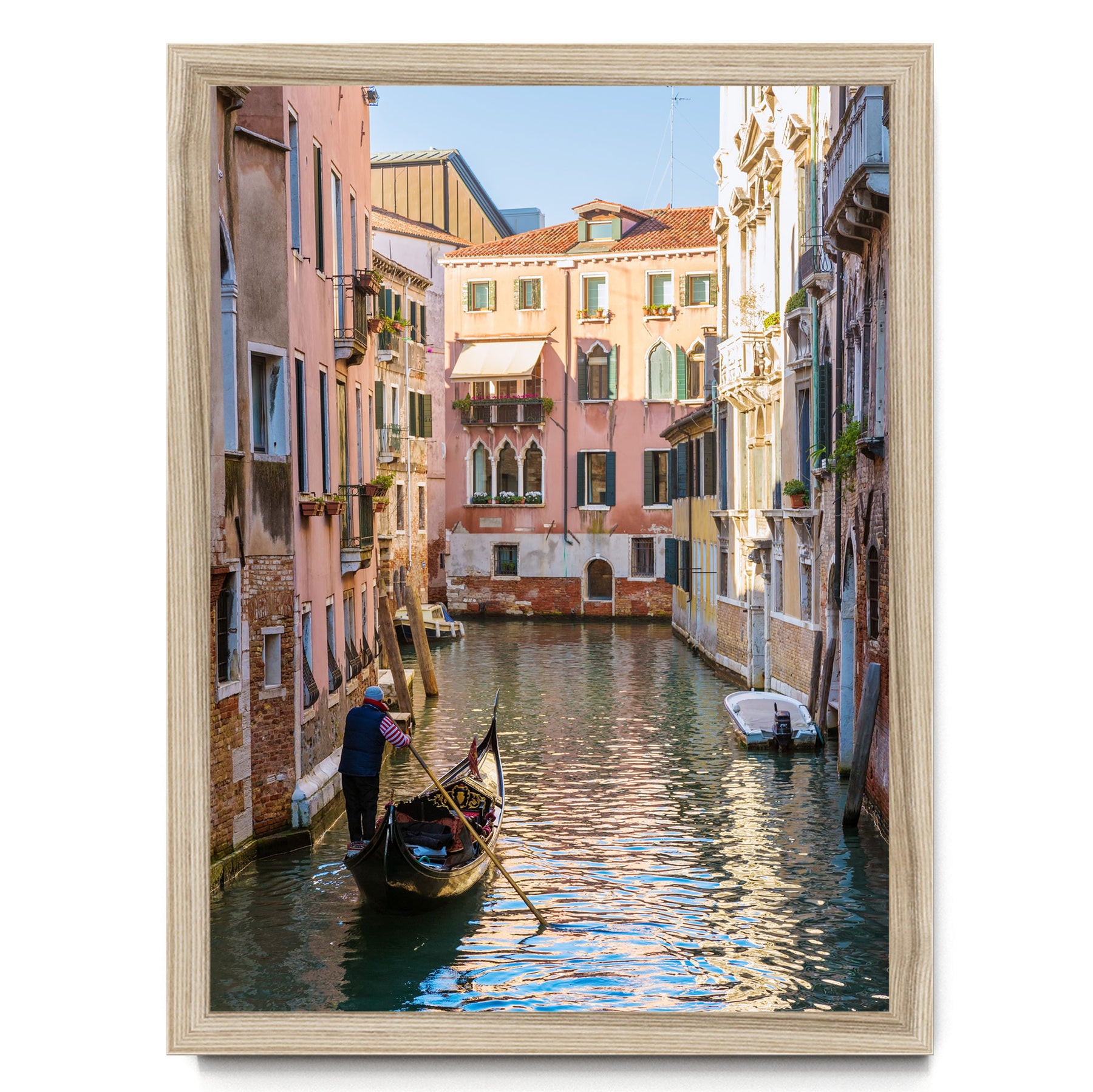 A gondolier in a traditional Venetian gondola navigates a picturesque canal in Venice, surrounded by colorful buildings and reflecting the warm sunlight.