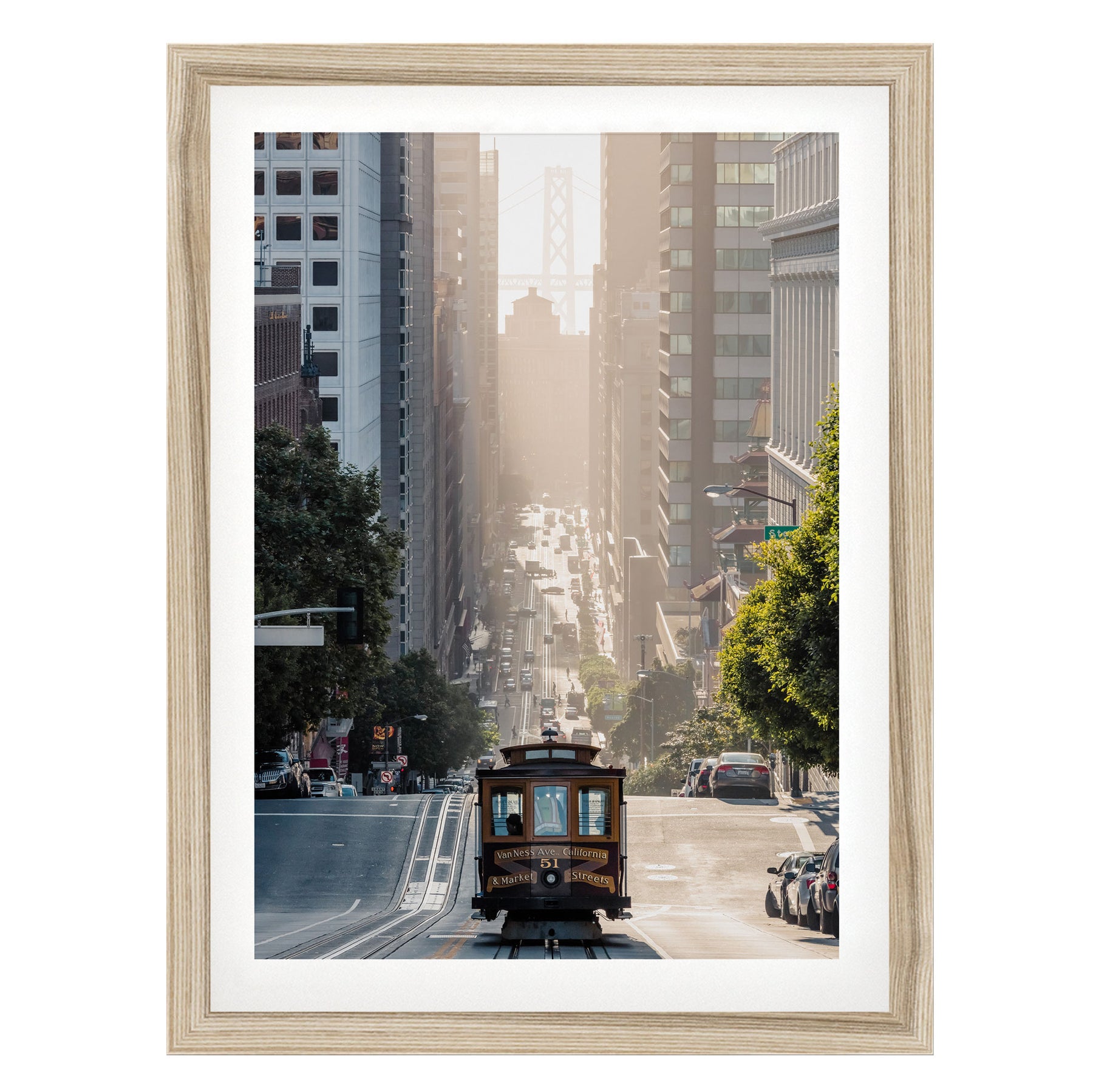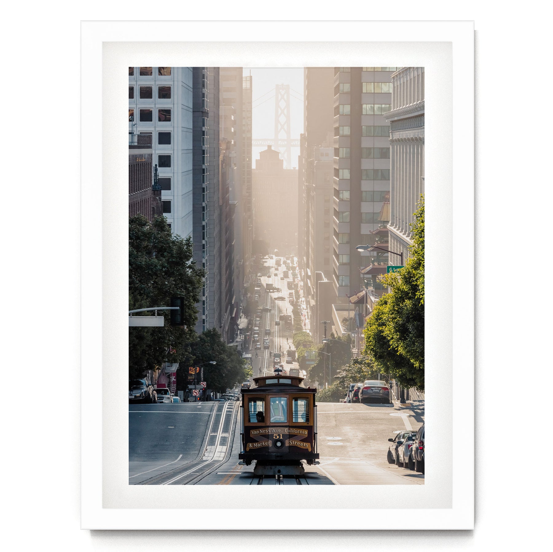 A framed photograph depicting a trolley car traveling down a busy street in San Francisco, with tall buildings and a bridge in the background.